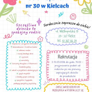 Rekrutacja do Przedszkola 2026/2027 7 MarzecDrodzy rodzice, Przypominamy, że do 10.03.2026 r. trwa rekrutacja do Przedszkoli Samorządowych. Serdecznie zapraszamy do naszej placówki.