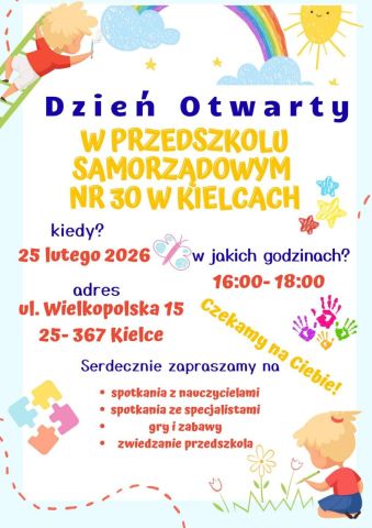 Serdecznie zapraszamy przyszłych przedszkolaków wraz z Rodzicami na Dzień Otwarty, który odbędzie się 25 lutego w godz. 16:00–18:00.