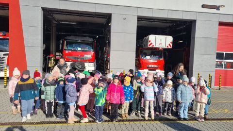 W dnie 19.11..2025 nasze najstarsze grupy odwiedziły jednostkę ratowniczo - gaśniczą Straży Pożarnej na ul. Sandomierskiej w Kielcach.  Podczas spotkania strażacy opowiedzieli o swojej pracy, pokazali dzieciom sprzęt ratowniczy oraz wyjaśnili, jak wygląda codzienna służba. Przedszkolaki mogły z bliska zobaczyć wóz strażacki, przymierzyć hełm ochronny, a nawet usiąść w kabinie kierowcy! Największą atrakcją była prezentacja sygnałów dźwiękowych oraz udział w symulowanej ewakuacji.