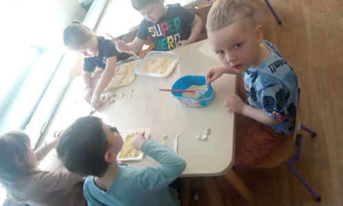 Dziś w grupie 2 odbyły się zimowe zabawy sensoryczne. Dzieci rysowały po „śniegu” z mąki, tworząc palcami i pędzelkami różnorodne wzory oraz ślady.